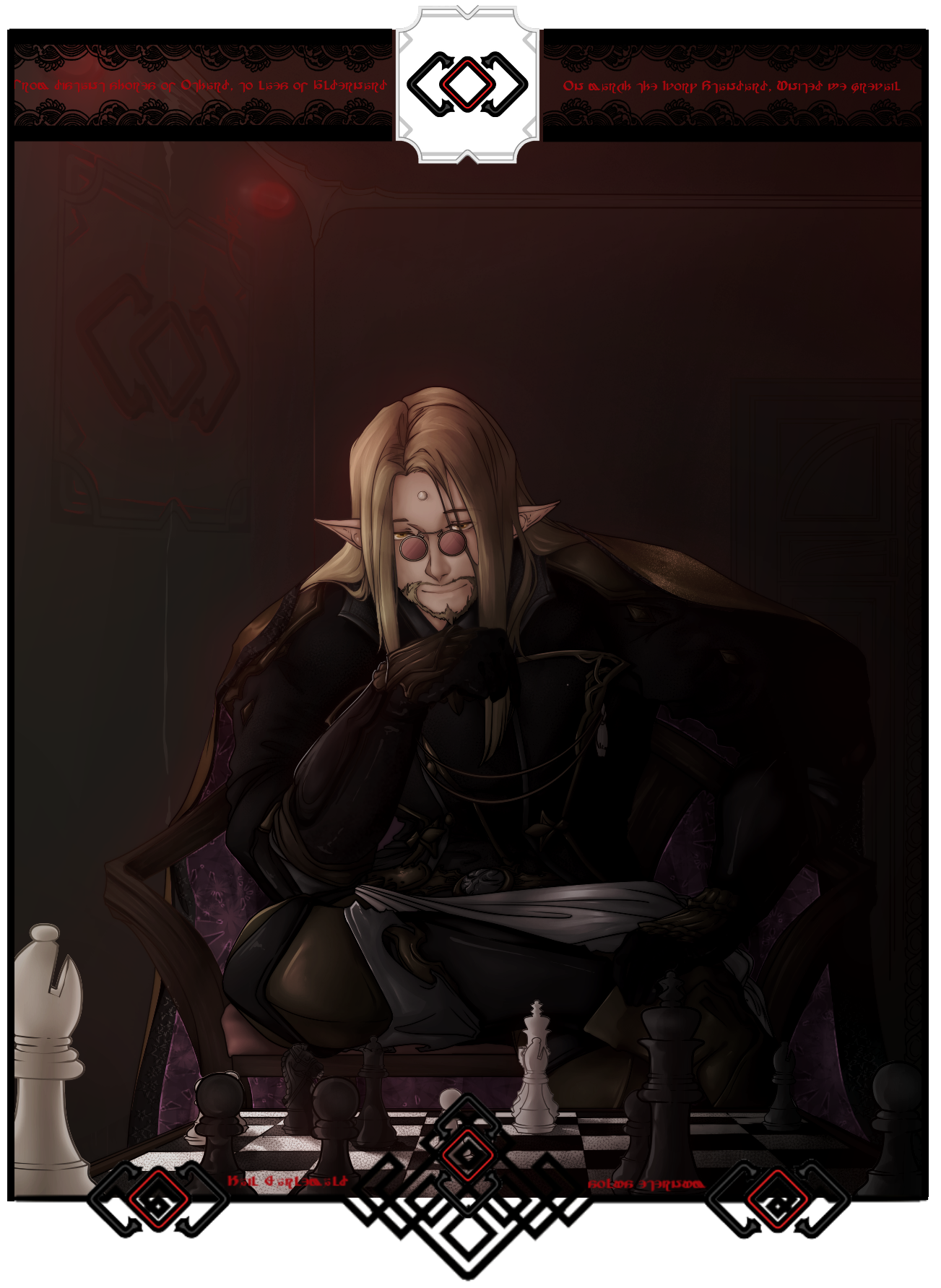 The young man stood coldly, his golden, analytic gaze staring downwards, upon the growing lake of crimson red. A figure slept within, one he might have once known, yet one that never had a single thought for him, so utterly motivated in its own excess. Even now, his presence, him, the harbinger of the figure’s fall, was prompted by a desire to secure the figure’s own, selfish legacy. Such vile scoundrel deserved no more air to breathe in this world. He lifted the dagger, golden eye descending to peer at the polished, blood-stricken steel. There, he found only his own, glowing gaze, yet in such mirrored sight rested a demon in it’s own right. Was this righteous? Was this path justified, or was the pandora’s box he had blown open a poisonous treasure of it’s own right?Sin, paid for and avenged in sin. After twenty years, golden-mane had righted the wrong that was perpetrated, by committing an even greater crime. Such irony did life have in store at times like these.Patricide. Such a formal, weighted word. One of the greatest sins of men, even when such was fully deserved. At the very least, it could not be blamed on selfishness of the perpetrator’s own- this would serve a grand jumping board, to further the great ordeal that he had become apart of, and thus would his time and life gain more value that the old man ever had. As the ordeal he once sought to follow another in now shook with the failure of his master and hero, it had to now fall unto the Son of the Elezen to take the necessary measures to keep His Dream alive, whatever the costs might have been; he owed it to those who saved his life, who wished for a life better for all mortals.But now, where is the brightness of bygone days?